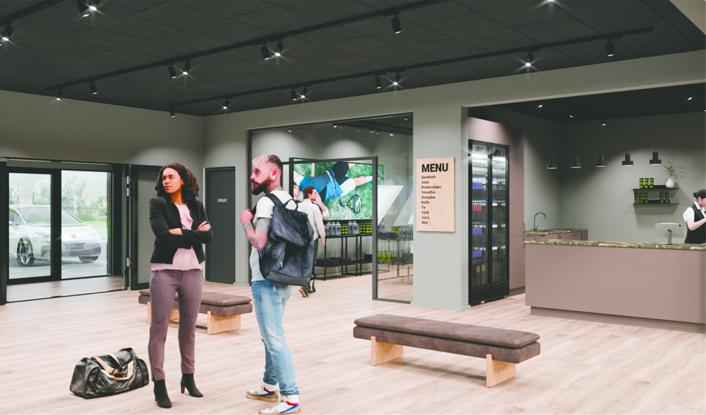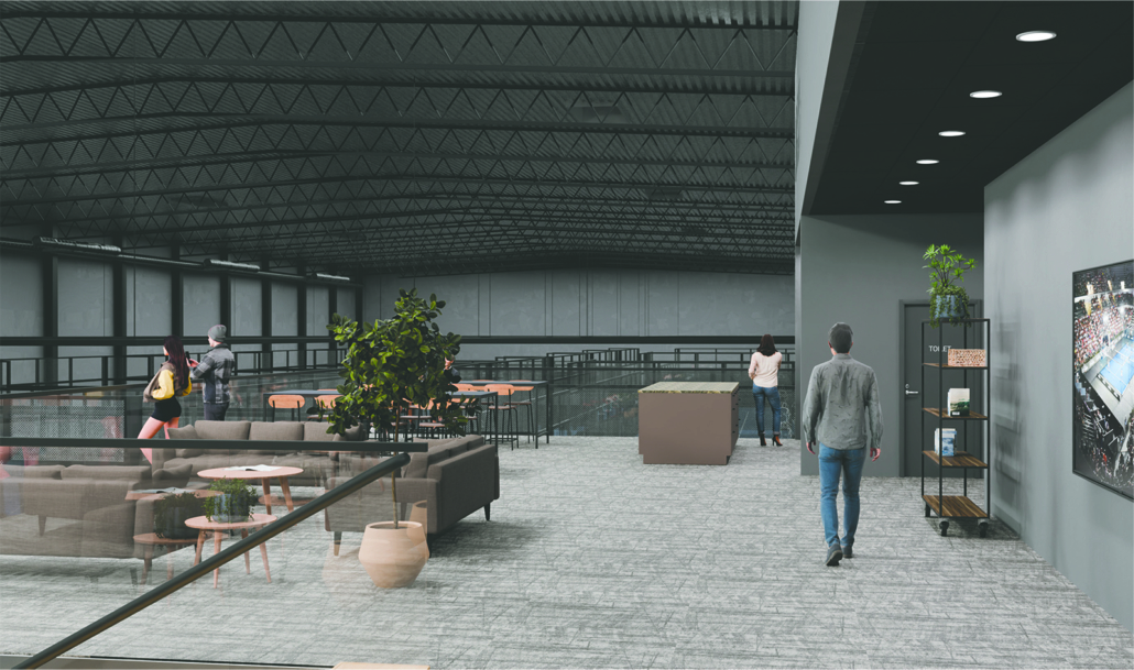 11 meter indvendig højde og god plads mellem banerne. Stor lounge tæt ved banerne, samt 1. sal med lounge, mødelokale og spiseområde.